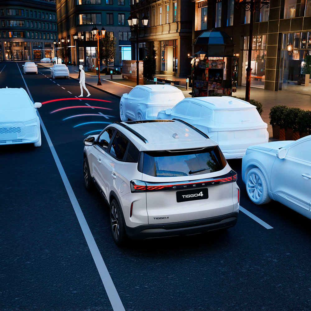 El TIGGO 4 | CSH incluye faros delanteros y traseros LED, luces diurnas LED (DRL) y faros antiniebla traseros para mayor visibilidad. Cuenta con llantas de aleación de 17”, espejos exteriores color carrocería con luz de giro y apliques cromados que realzan su estilo moderno y elegante.